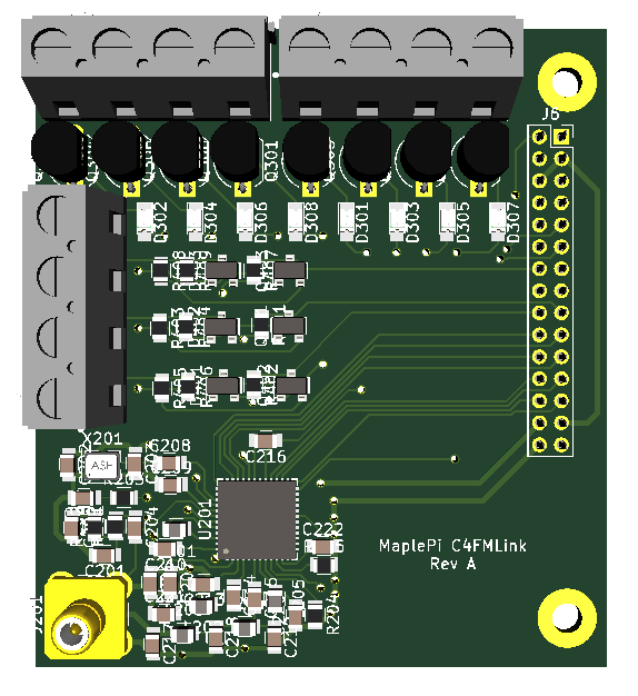 The C4FMLink module provides a single chip transceiver for the 430-450MHz band to implement a local hotspot for digital radio protocols. The supported protocols are:
