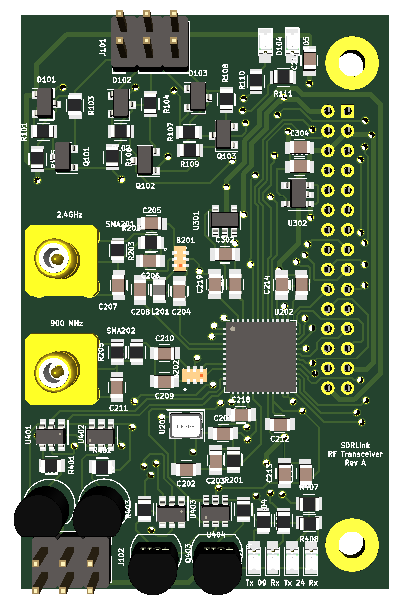 The SDR Link top HAT transceiver uses an AT86RF215 which contains two independent transceivers in the 900 or 2400 MHz bands. Both are low power at -14dBm, but using an external power amplifier the 900 MHz radio can output up to 20 watts, and, with an external 12dB gain Yagi antenna, can provide a link that can span over 60 Km with line of sight.
