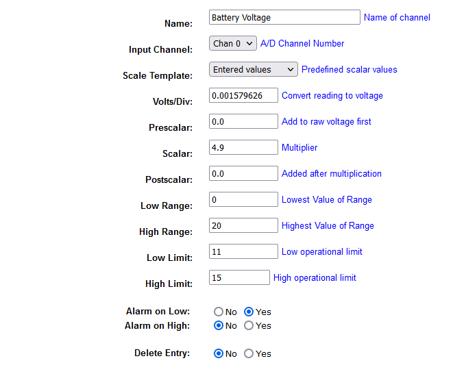 The configuration and monitoring software runs on a web-based platform. The figure below shows a sample configuration for the battery voltage. It consists of data to restore the original value, the range and operational limits. Alarms are generated based on high or low thresholds, or both.